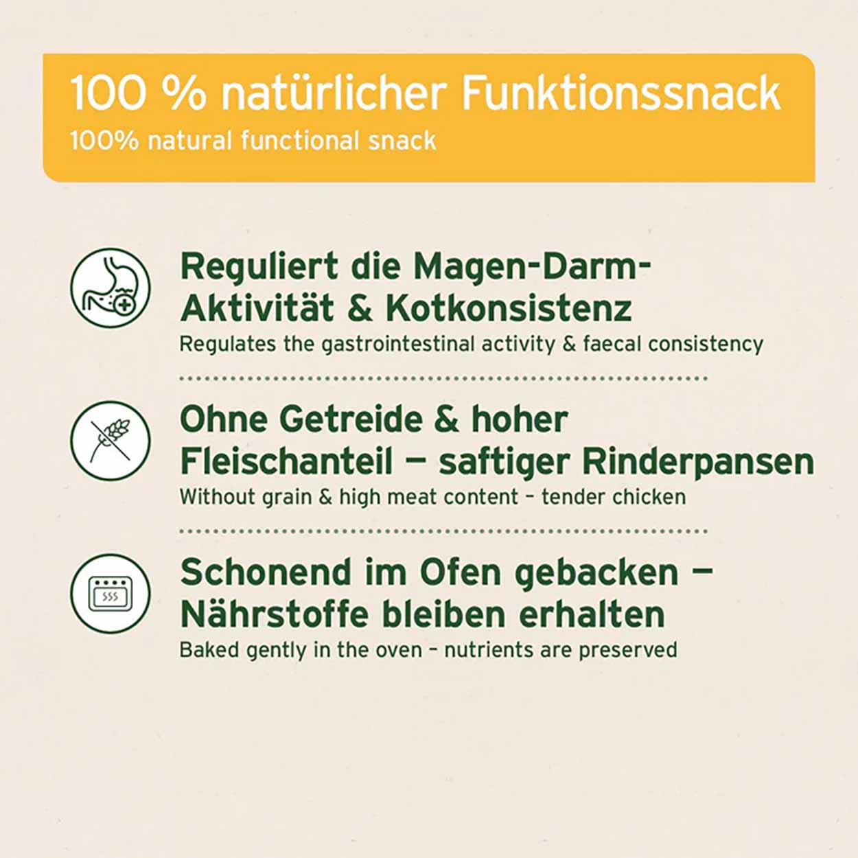 Wohlsein geht durch den Magen! Die Beziehung zu Deinem Hund ist etwas ganz Besonderes, die täglich gepflegt werden sollte. AniForte® Magen & Darm-Snacks sind die clevere Art Deinen Hund zu belohnen und gleichzeitig sein Wohlbefinden zu unterstützen. Die schmackhaften Snacks enthalten extra viel feines Hähnchenfleisch und eine optimal aufeinander abgestimmte Mischung von natürlich-wertvollen Substanzen, und dem Plus an probiotischen Bakterien. Damit der Bauch sich wieder wohlfühlt!