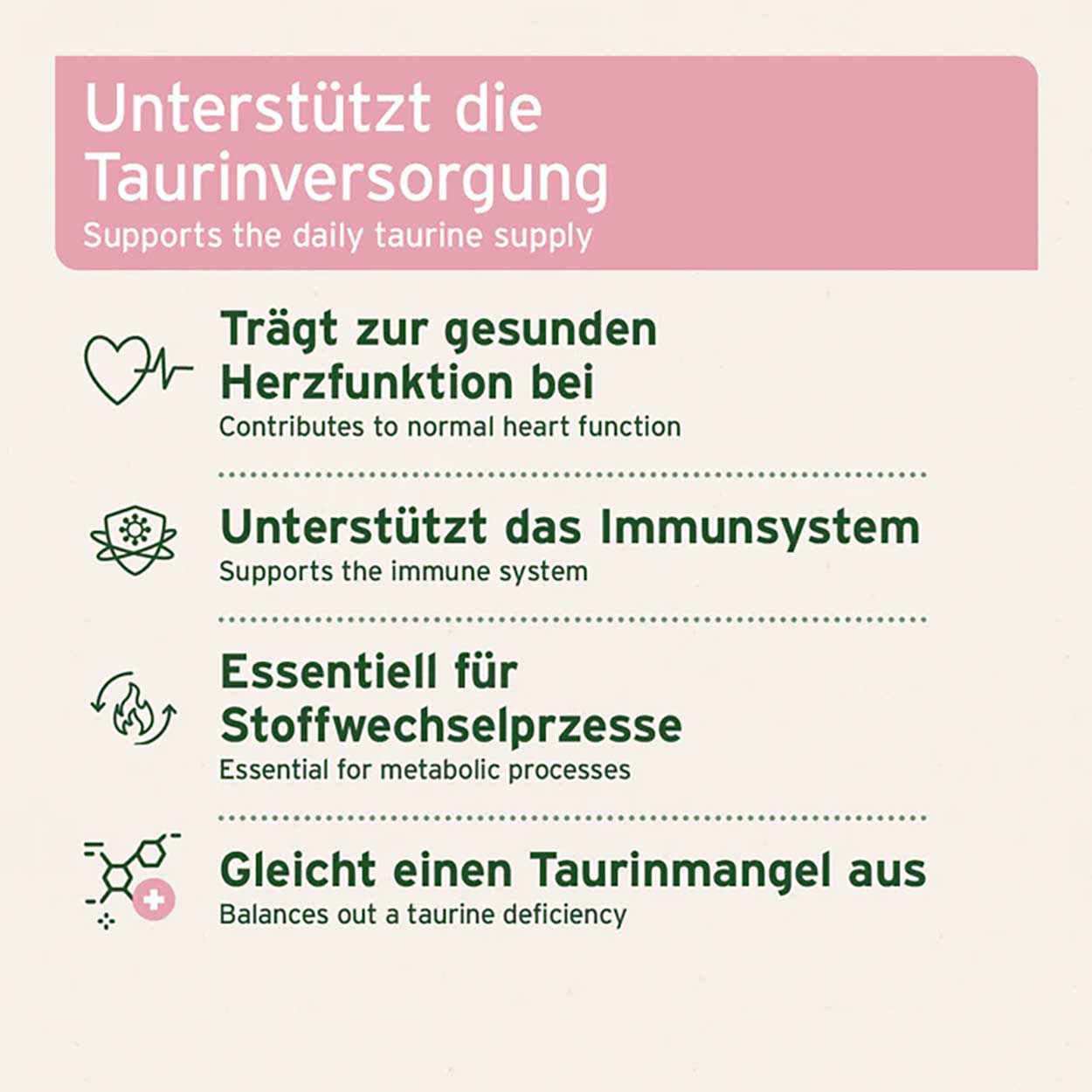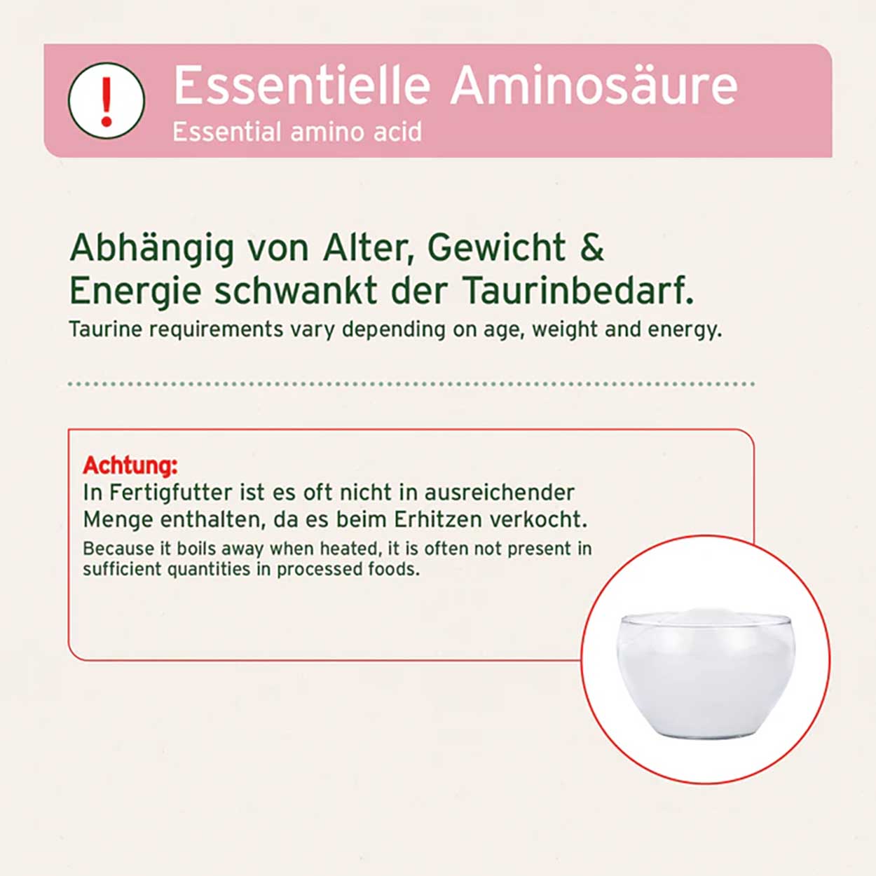 Das Taurin kann einfach unter das tägliche Futter gemischt werden. Empfohlene Werte für den Höchstgehalt an Taurin/kg Alleinfuttermittel mit einem Feuchtigkeitsgehalt von 12 % sind 2.500 mg.