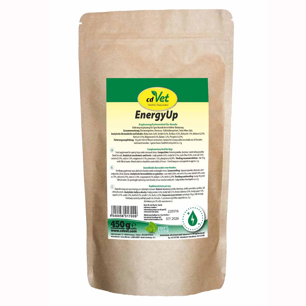 EnergyUp kann schnell und wirkungsvoll die Verluste an Elektrolyten und Vitalstoffen ersetzen, die während eines Wettkampfes, des Trainings oder einer Stresssituation entstehen. Durch den kurzfristigen Ausgleich dieser Verluste kann die Leistungsfähigkeit Ihres Hundes erhalten und verbessert werden. EnergyUp ist reich an Mineralstoffen, wie z.B. Magnesium, Folsäure, Phosphor und Kalium, und auch geschmacklich sehr attraktiv für Ihren Liebling.