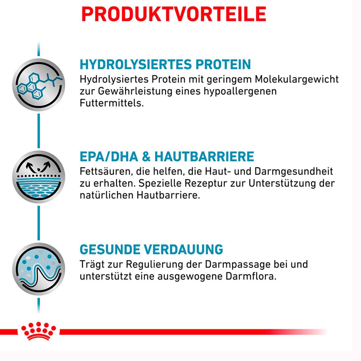 Hydrolysiertes Protein mit geringem Molekulargewicht macht diese Rezeptur zu einer hochverdaulichen hypoallergenen Nahrung. Die hydrolysierten Proteine senken das Risiko einer Unverträglichkeitsreaktion.