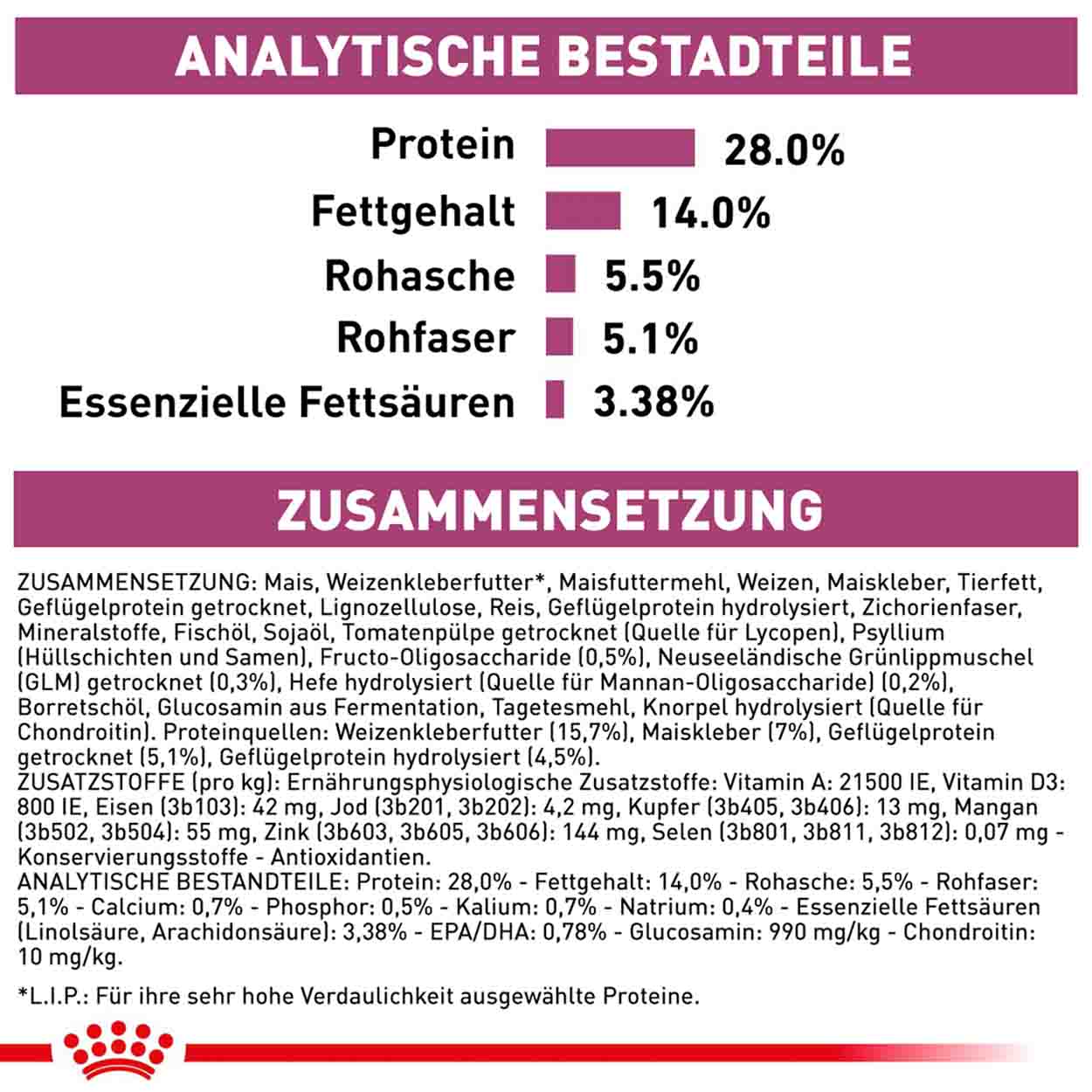 Mais, Weizenkleberfutter*, Maisfuttermehl, Weizen, Maiskleber, Tierfett, Geflügelprotein getrocknet, Lignozellulose, Reis, Geflügelprotein hydrolysiert, Zichorienfaser, Mineralstoffe, Fischöl, Sojaöl, Tomatenpülpe getrocknet (Quelle für Lycopen), Psyllium (Hüllschichten und Samen), Fructo-Oligosaccharide (0,5%), Neuseeländische Grünlippmuschel (GLM) getrocknet (0,3%), Hefe hydrolysiert (Quelle für Mannan-Oligosaccharide) (0,2%), Borretschöl, Glucosamin aus Fermentation, Tagetesmehl, Knorpel hydrolysiert (Quelle für Chondroitin). Proteinquellen: Weizenkleberfutter (15,7%), Maiskleber (7%), Geflügelprotein getrocknet (5,1%), Geflügelprotein hydrolysiert (4,5%).